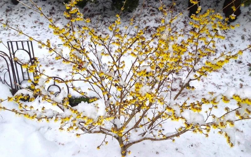 Heralding the arrival of spring, ‘Arnold Promise’ Witch Hazel may be the first flowering shrub to bloom in your gardens, along with Flowering Quince, Forsythia and a handful of others. In late winter to early spring, sometimes even when there’s snow on the ground, LOADS of fragrant, longer-lasting, bright yellow fringe flowers adorn every branch and stem on the shrub. Truly spectacular in bloom. Following the bloom, attractive bright green oval-shaped leaves emerge that darken in color as the season progresses turning to brilliant shades of yellow, red and orange with the arrival of cooler temperatures in fall. You can leave this one to grow naturally as a vase-shaped large shrub to maybe 15 feet tall and wide, or lower branches can be removed to form a highly attractive small tree. ‘Arnold Promise’ received the prestigious Award of Garden Merit from the Royal Horticulture Society, and the honor is well-deserved!