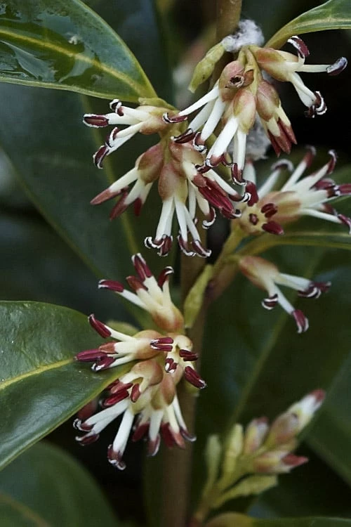 Handsome and loving life on the shady side, even the deepest shade, the Himalayan Sweet Box is a compact, low-growing, broadleaf evergreen shrub that spreads slowly to form a colony. The thick and glossy lanceolate leaves provide a fine texture in the landscape. It is a perfect choice for growing under large trees, decks and other shady areas and around patios, porches and other outdoor sitting or living spaces where in late winter its abundant clusters of dainty white flowers with a fragrance like hyacinths can be enjoyed from close up. The flowers are followed by attractive, lustrous black berries. Himalayan Sweet Box is very easy to grow and drought tolerant when established, but do make sure to avoid direct afternoon sunlight as it causes the leaves to lose their luster. Deer and rabbits don’t touch it in our gardens.