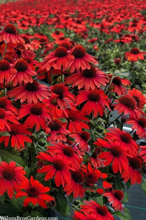A hybrid of our North American native Echinacea, the Panama Red Coneflower blooms from late spring or early summer through early fall featuring exceptionally large, 5-inch diameter fragrant flowers with prominent, deep red center cones surrounded by a skirt of brilliant red petals that transition to orange-red shades. In our gardens the flowers start showing up in late spring and continue to late summer, sometimes with additional sporadic bloom until frost. Butterflies, hummingbirds and other beneficial pollinators love the flowers, and the birds love the seeds. So make sure to leave some spent flowers on the plant towards the end of the flowering season. The long-lasting flowers are also excellent for cutting and use in fresh or dried floral arrangements. At 12 to 14 inches tall and 14 to 16 inches wide, Panama Red is a perfect fit as an accent in smaller gardens spaces and containers or in groupings or as a border where space allows. A very hardy and showy flowering perennial that will return year after year in the garden.