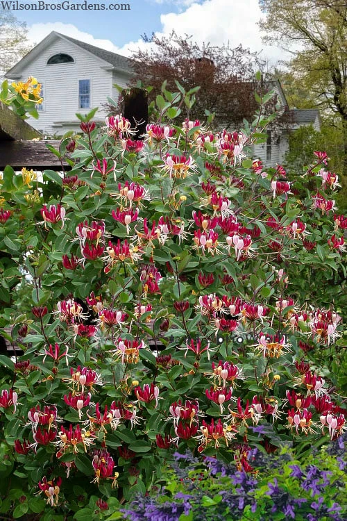 Climbing 8 to 20 feet tall and 3 to 6 feet wide, Serotina Honeysuckle is a more well-behaved variety ideal for use to grow on fences, rails, posts, mailboxes, trellises, trees and other structures or supports its vines can twine around. Also makes for a nice groundcover plant and spiller over walls. A fine addition to hummingbird gardens, cottage gardens and fragrance gardens.
